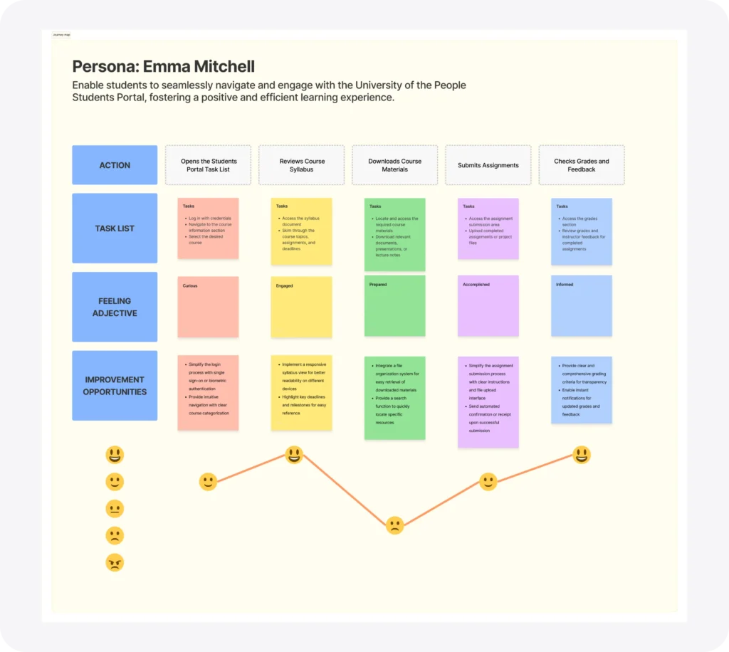 Busy student Emma Mitchell needs a Students Portal that’s super easy to use. She wants quick access to important info, smooth task management, and a simple, friendly experience. Without these tweaks, Emma’s academic journey might hit a few bumps, affecting her productivity and overall satisfaction.